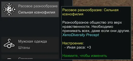 Мод XenoDiversity Precept создаёт идеологическую заповедь "Расовое разнообразие", регулирующую отношения между представителями разных рас, населяющих колонию.