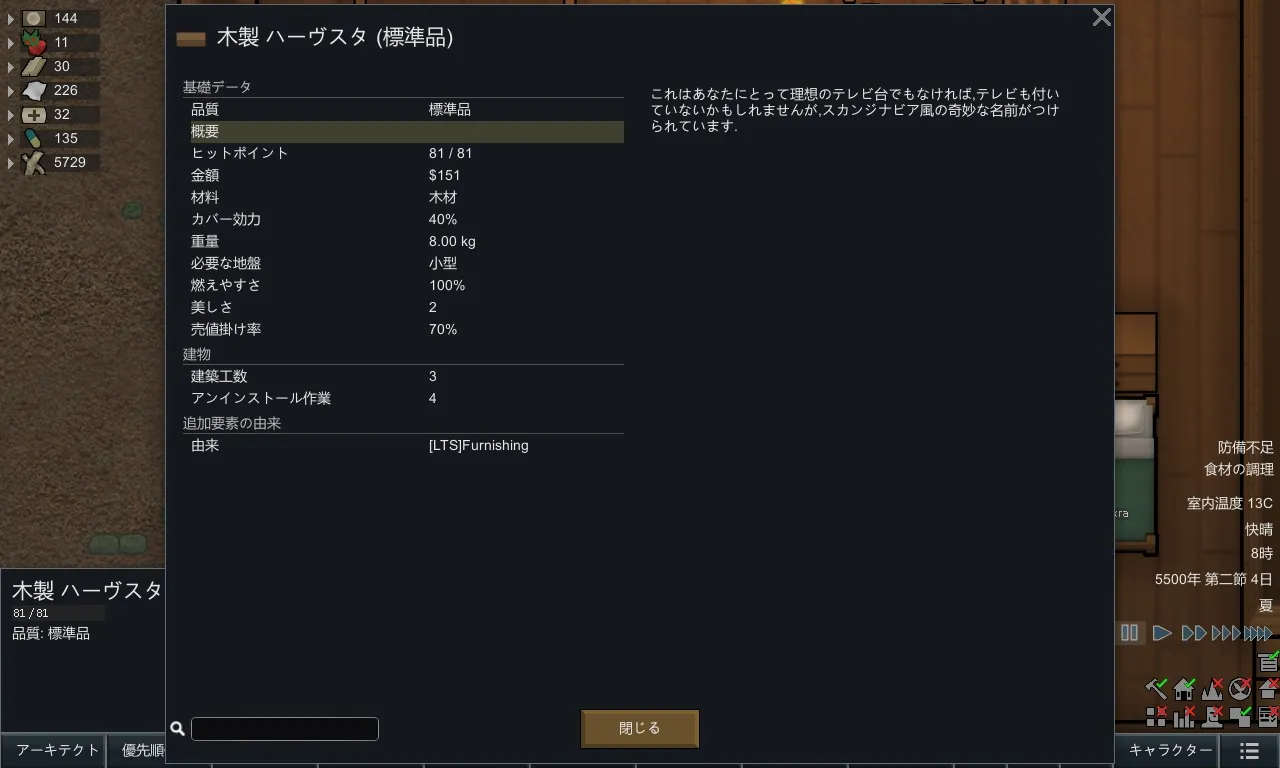 This Mod is adding a Japanese translation to the original Mod "[url=https://steamcommunity.com/sharedfiles/filedetails/?id=2567438519][LTS]Furnishing[/url]".