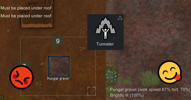 This mod removes the restriction that fungus gravel can only be built under thickroof, allows you to build under constructed roof or without any roof depends your setting.