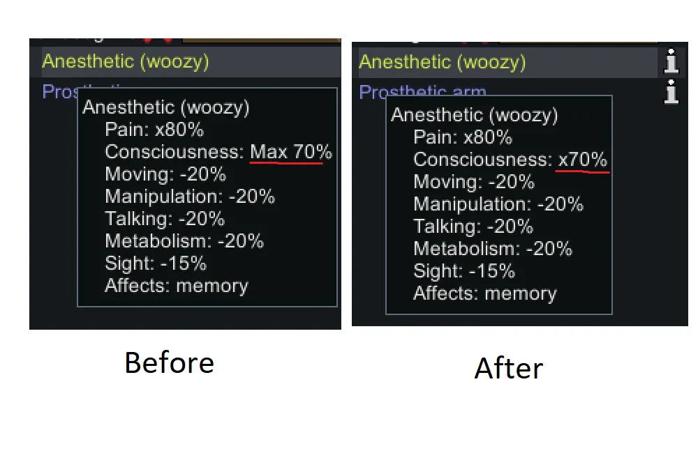 THIS MOD IS 1.3 LEGACY. Go [url=https://steamcommunity.com/sharedfiles/filedetails/?id=2878658604]here[/url] for the 1.4 version. Anesthetic hediff now multiplies consciousness level, rather than capping it.