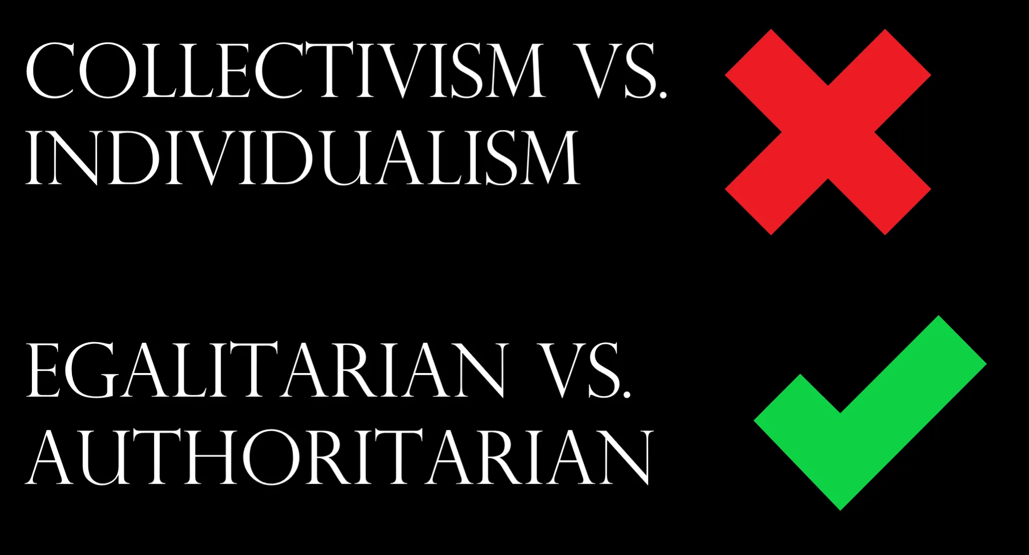 Individualism is almost entirely a [i]cultural[/i] thing. This is why you have people both proclaiming to be [i]individualists[/i] and [i]patriots[/i], two things that ought to be oxymoronic. The actual difference is between the egalitarians who respect individual rights and detest slavery in all forms, and the authoritarians who don't respect individual rights and are cool with slavery.