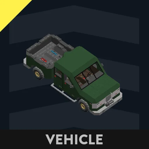 this is my pickup truck. it just uses the prebuilt starter engine. just turn the key and she fires right up. it is a 4 door 2wd truck that has several bays in the bed to add tools and supplies, plus the bed also has 12 additional seats for passengers. 15 + driver total seats in vehicle. there are a couple firearms w/ammo in the cab along with first aid and a fire extinguisher. the winch up front works, the tailgate works, it has working lights both interior and exterior. i tried to make it as "realistic" as i could so i built the frame first and built a bed and cab over it hopefully allowing easy removal of the bed while still keeping it a functional vehicle. the rear hitch has a release button under the rear bumper to attach/detach a trailer. i am not the best builder nor do i know all the tips and tricks or easiest ways to do things, it is just fun to do. hope this truck is useful to you.