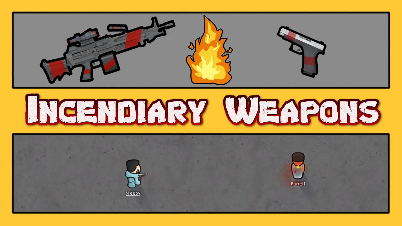as of now this mod contains a pistol and an LMG that will light targets on fire upon contact, will not light ground on fire, only pawns. they are great crowd control as you can easily light a horde of angry tribesmen on fire while you watch laughing maniacally.
