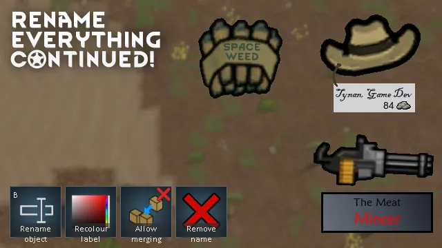 With this revolutionary mod, you can now rename almost anything that you can select - whether they are weapons, your favourite turret or a random tree! You can also recolour the labels of anything that you can rename too.