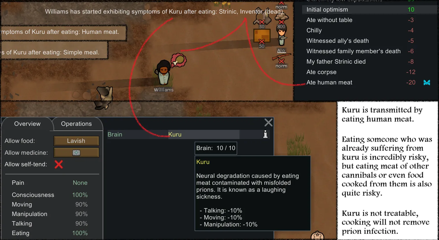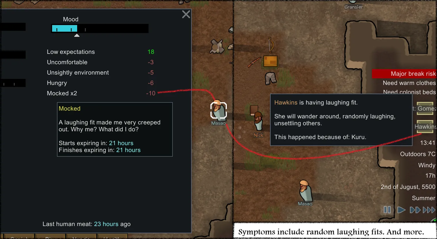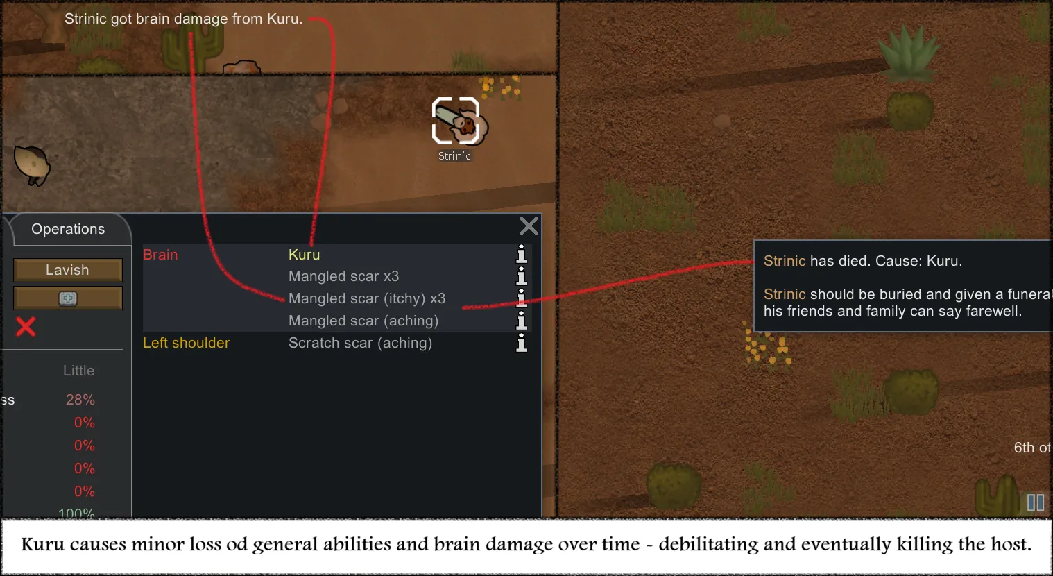 Kuru causes mood instability, giving pawns chance of various mental breaks, inluding severe Laughing fits.