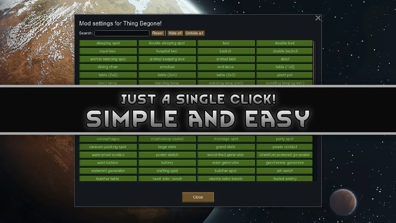 Tired of bloats? Those pesky squares taking up your screen? Well, worry no more! With Gizmo Begone, a single click can fix it all. By simply going to Gizmo Begone's settings, you'll find every ThingDef and TerrainDef you'll never need. Click on the button and voilà, it's like it never existed. The Gizmo for that buildable would be hidden, even on god mode. If you like what you see, come on down and subscribe!