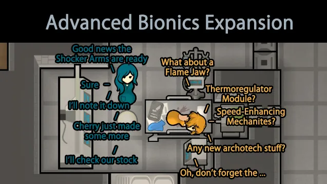 This mod includes my other mod Vanilla Bionics Expansion which fills in all the missing vanilla prosthetics, bionics and archotech so it's not required. This mod expands the scope past the normal vanilla bionics. It adds a new set of advanced bionics with 150% efficiency and a number of different implants that can be installed in various locations. To craft them you must acquire Tech Prints and research new ultra tech research projects. Advanced bionics generally cost double their normal counterparts.