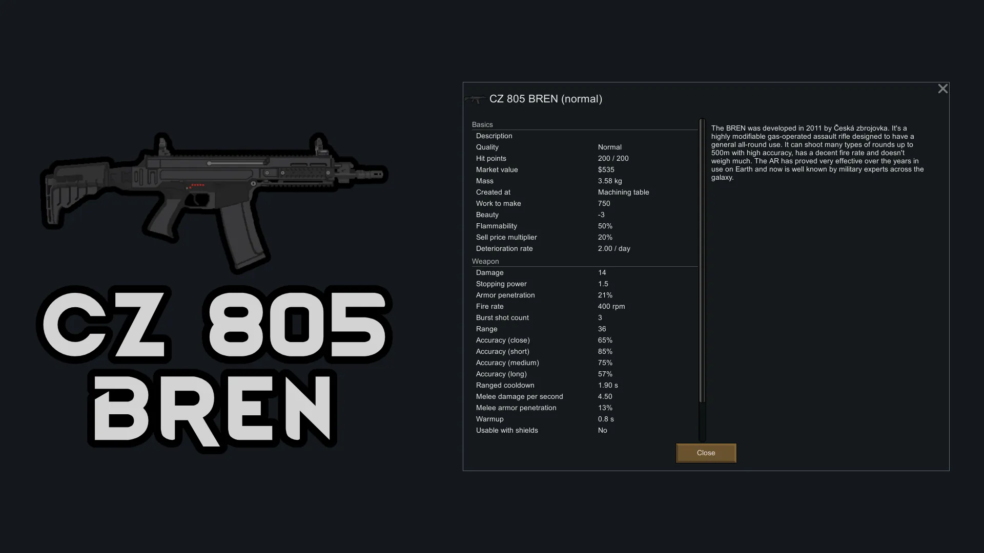 [b] CZ 805 BREN [/b] - One of the more known Czech weapons. An assault rifle with more damage and range compared to the vanilla one in exchange for cooldown, warmup and resource cost.