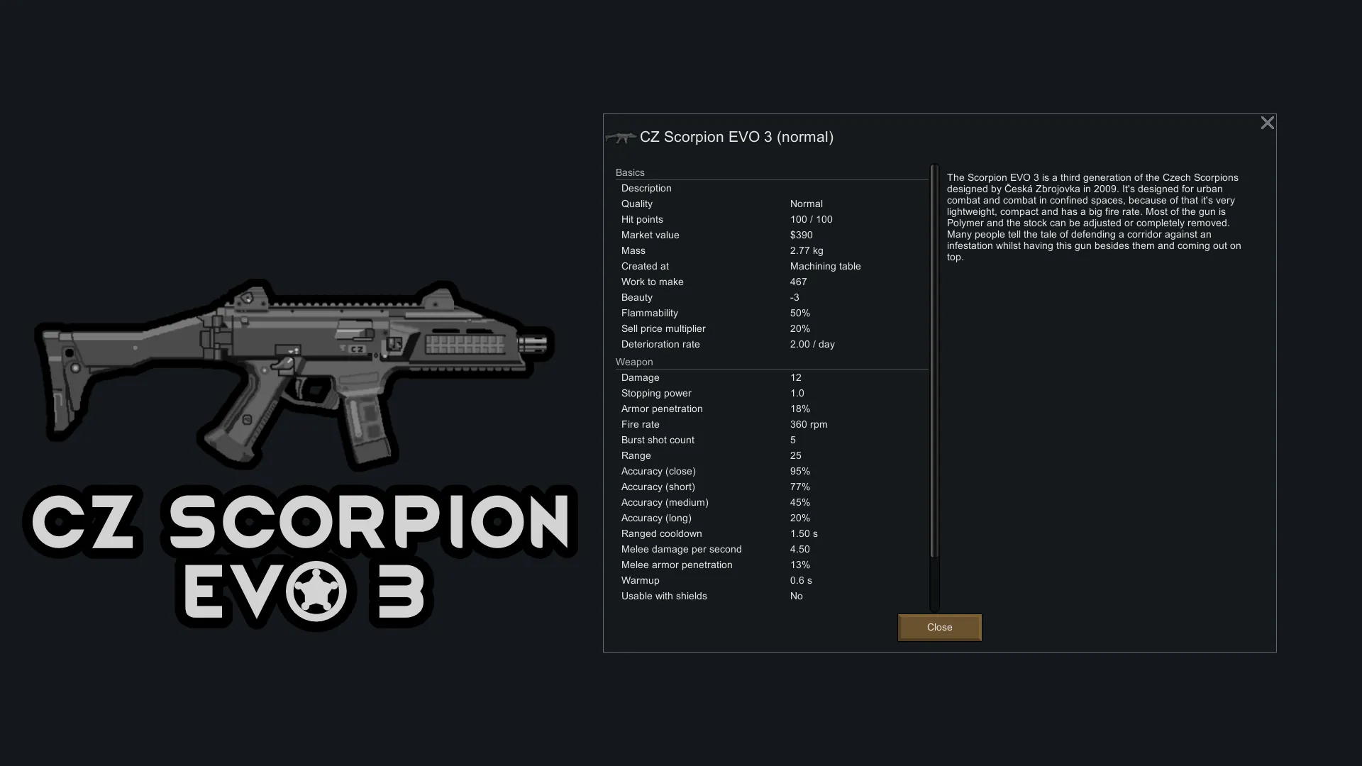 [b] CZ Scorpion EVO 3 [/b] - One of the more known Czech weapons. An iconic submachine gun with high fire rate and rounds shot per burst in exchange for range and damage. (picture 2)