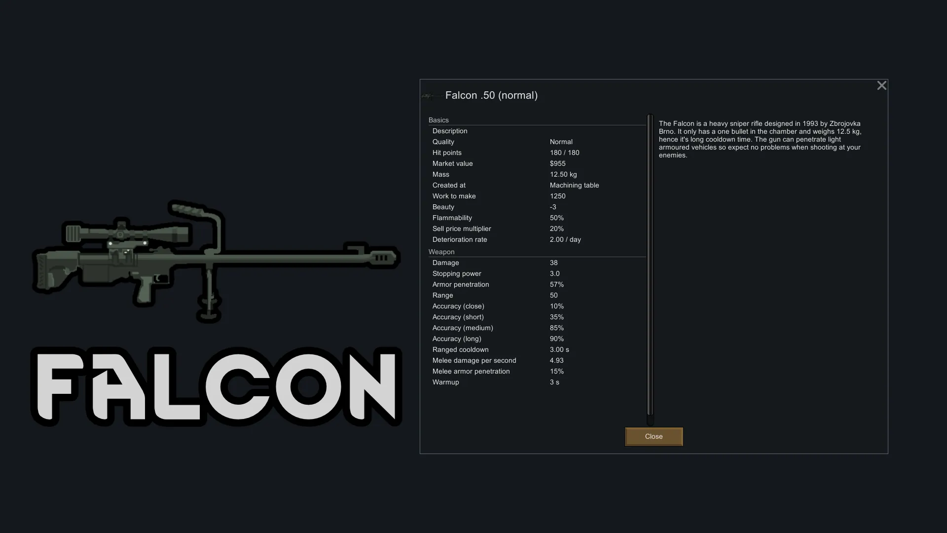 [b] Falcon [/b] - The Falcon is sadly not well known, however your enemies will probably not forget it. It's a heavy sniper rifle capable of one-shotting a un-armoured opponent. This gun should be mid-late game and is spacer/mercenary tech. Shoots .50 rounds, thus ignores 60% of armour and requires expensive resources and high skill to be crafted. (picture 3)