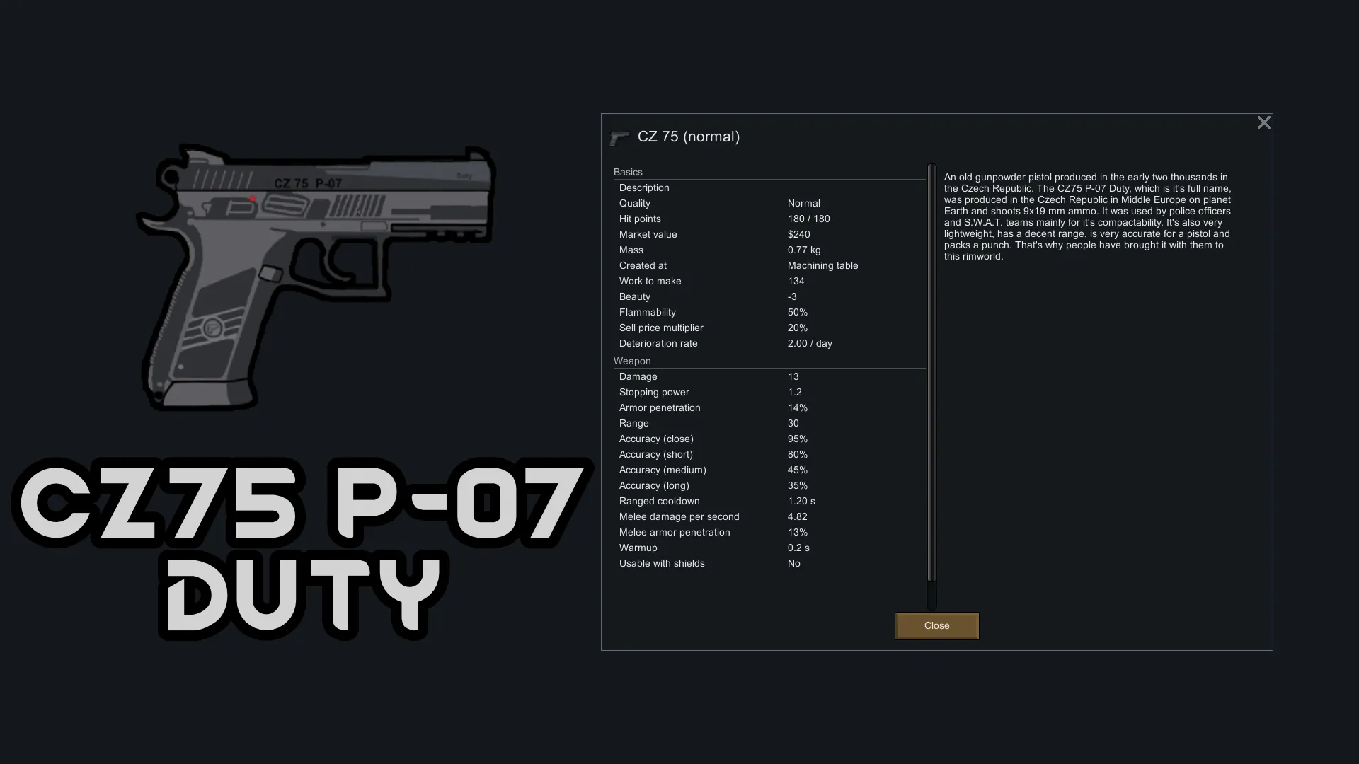 [b] CZ 75 P-07 Duty [/b] - Pistol, Industrial level. A big upgrade to the common revolver, offset by the need of Plasteel and higher crafting skill. (picture 5)