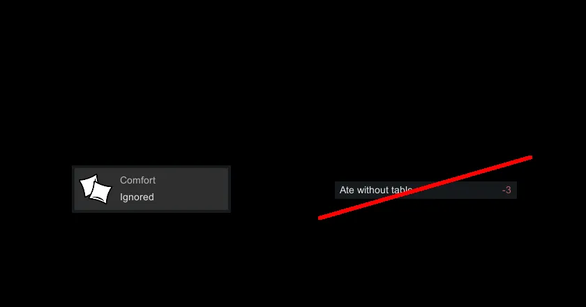 If ideoligion precept Comfort:Ignored is used, pawns with this ideoligion do not get the 'ate without table' mood debuff.