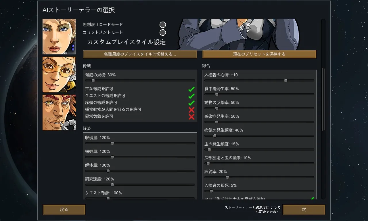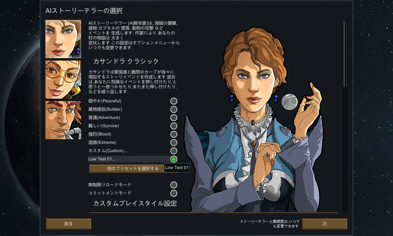 ゲームを始める際のストーリーテラーの選択で、難易度カスタム(Custom)を選び、各種スライダーを調整したり、毎回設定した数値を思い出すことなく、お気に入りのストーリーテラー設定を再び作成できます。
