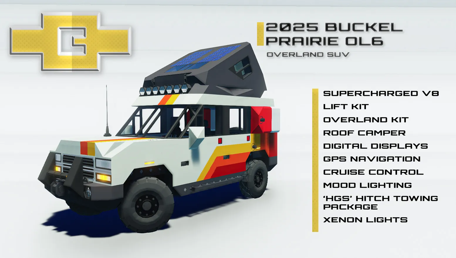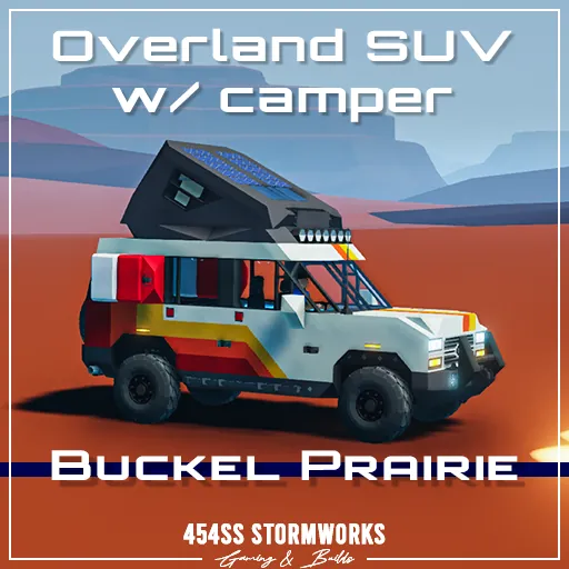 The Buckel Prairie is a full-size consumer SUV produced since 1992, used by fleet services, police departments and middle-upper class families. It features three rows of seating, and ample horsepower for towing. This particular unit is the OL6 trim, which features a supercharged V8 engine, large off-road tires, a roof mounted camper, and overlanding kit. The kit includes gear to survive extended travels through uninhabited areas, such as repair gear, extra fuel tanks and spare parts. The interior includes mood lighting, digital displays, GPS navigation, leather seats and a moonroof. The hitch towing package allows medium-duty towing, and automatically pairs with trailers lights and brakes.