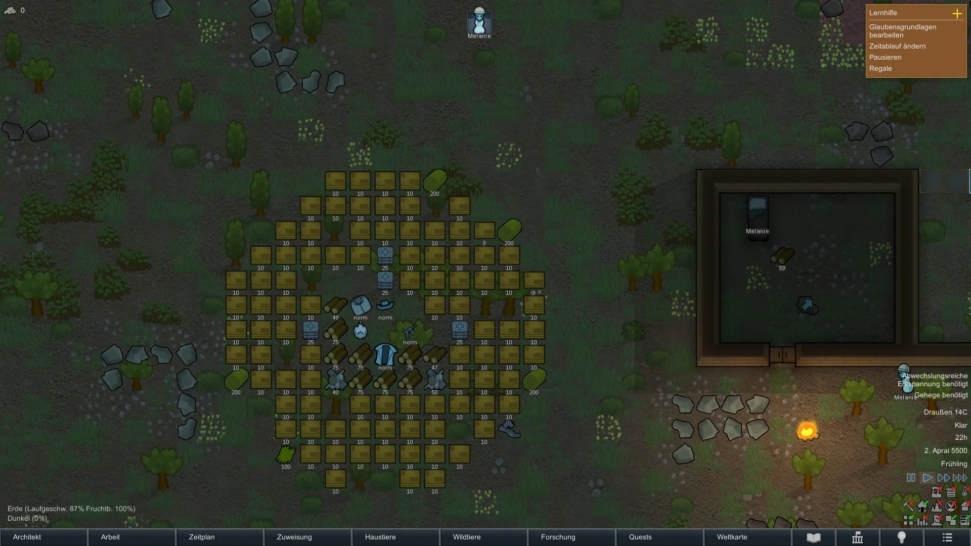 A newcomer with a lot of starting resources, which can be used very well as a sandbox game, especially if you are new to Rimworld. I've packed a lot of food, the best medicine and a coat against cold and one against warmth. Cap and cowboy hat included. There are also four chickens and a dog / husky. The state of research is on the battery, including the research that precedes it, so that you can start with more complex construction techniques and structures at an early stage. The research points for more complex furniture and clothing are already included for newcomers. All newcomers are grown up and have the ability to "learn quickly", which should help you a little with your character development.
