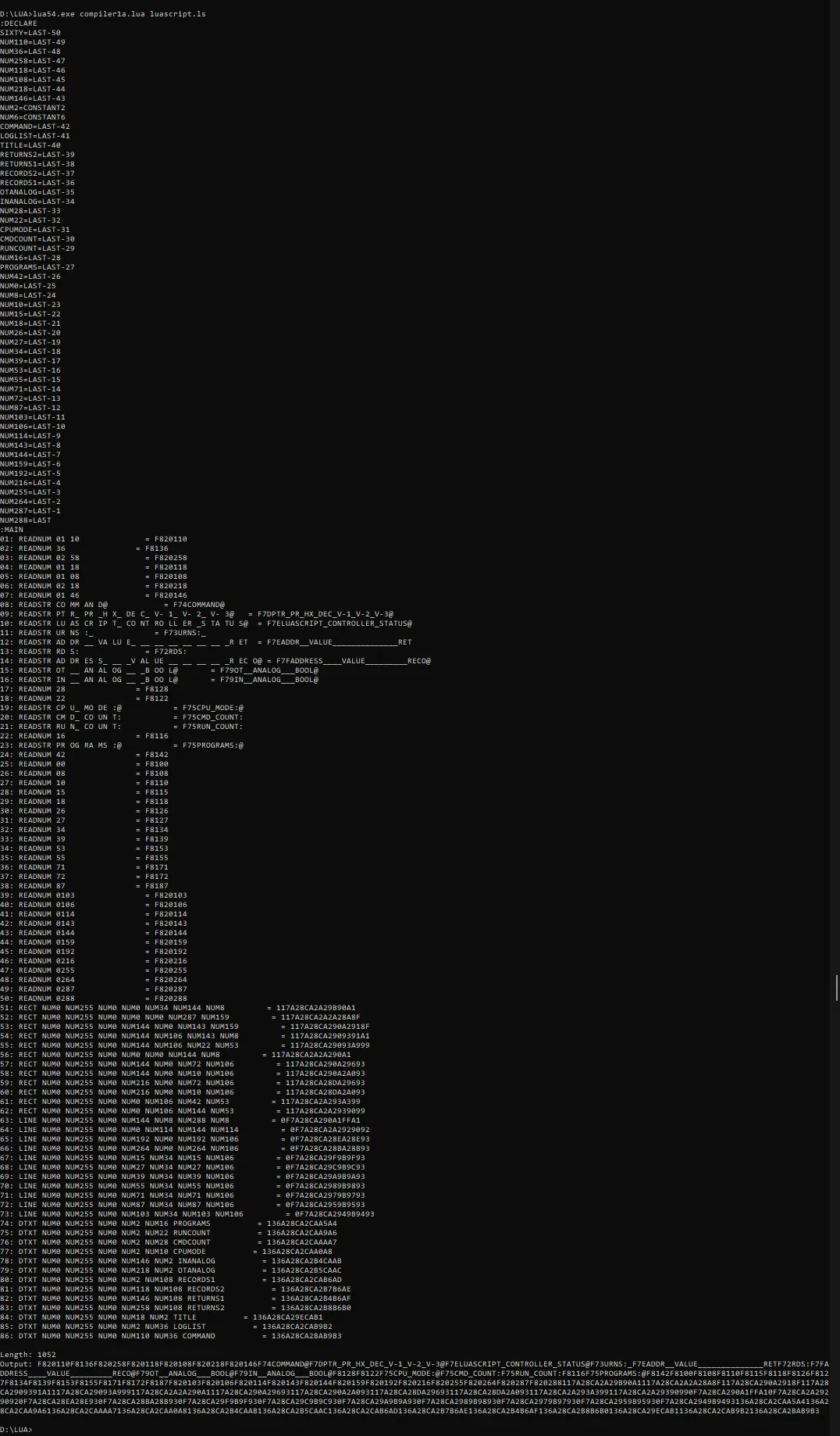 This is a programmable logic controller running an interpreter for a custom scripting language we are calling LUAScript. Using the compiler, you can produce LUA programs that can be stored and executed from property text boxes, extending the limit greatly of a standard script.