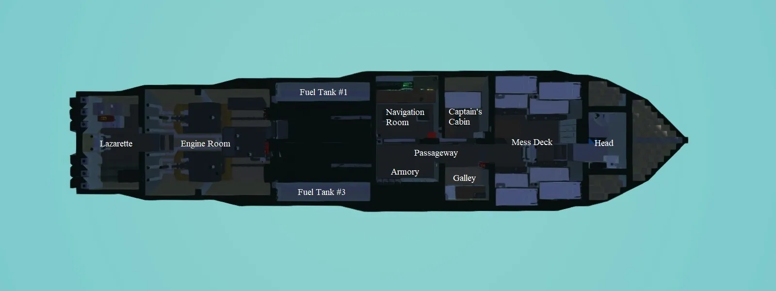 • Lazarette (accessible via engine room or deck hatch), used for storage of weapon supplies and spare equipment