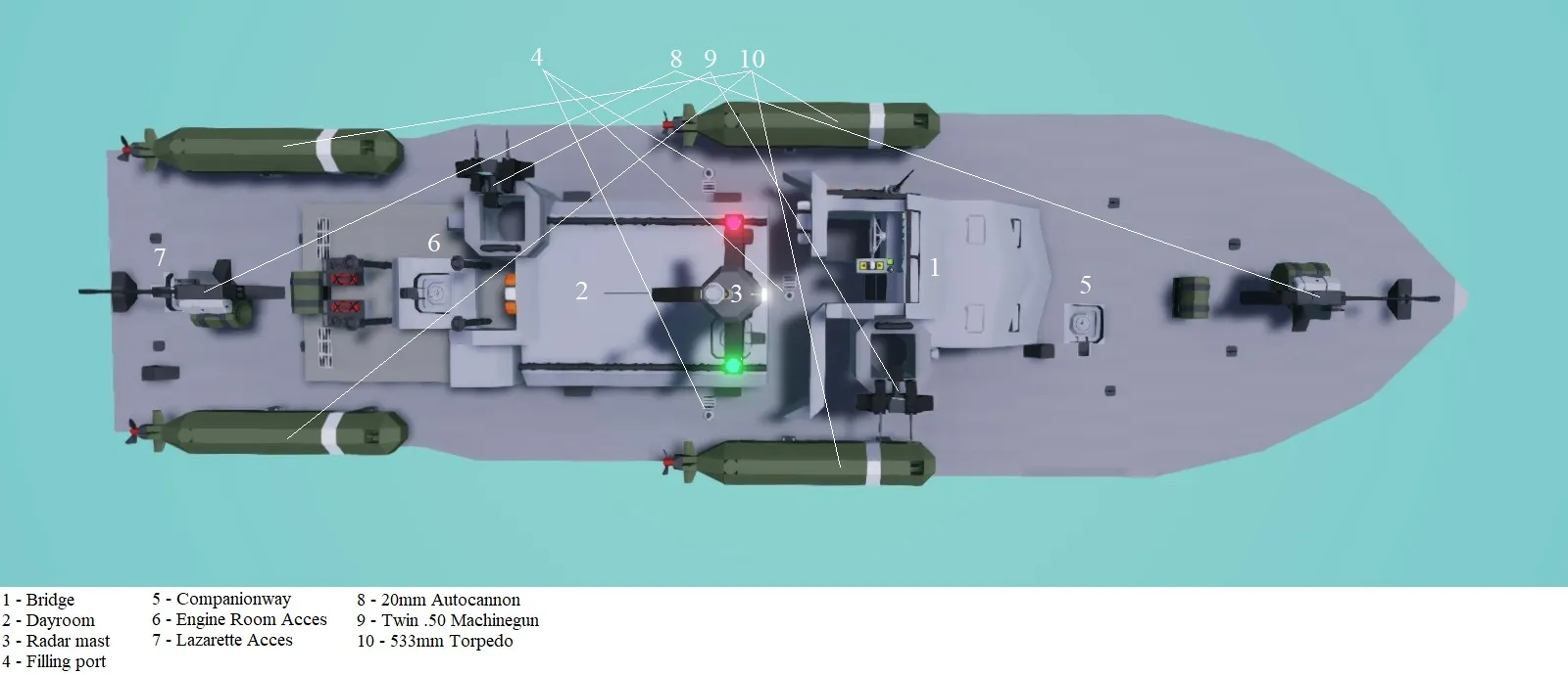 This craft is heavily inspired by the Elco 80' PT boat, but it is ultimately a fictional vessel — the PT-99.
