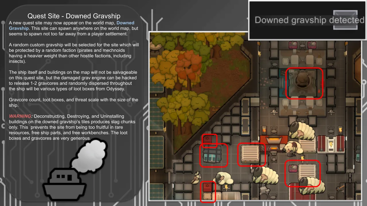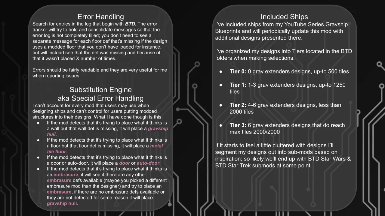 [*] The mod's [b]Substitution Engine[/b] has custom handling for many common defs for custom gravship spawning; if a specific def is missing from your game (mod not loaded that was part of the design) it will sub with a suitable def (modded wall = hull, embrasure from a different mod = embrasure from mod you have loaded OR hull if no embrasures, etc). If no appropriate sub can be made then the item will gracefully fail to spawn and it will be recorded in the log.