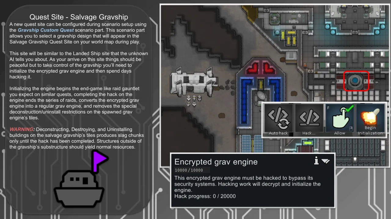 [*] [b]Salvage Ship Quest:[/b] New Game > Edit Scenario > Add "Gravship Custom Quest" > Select design