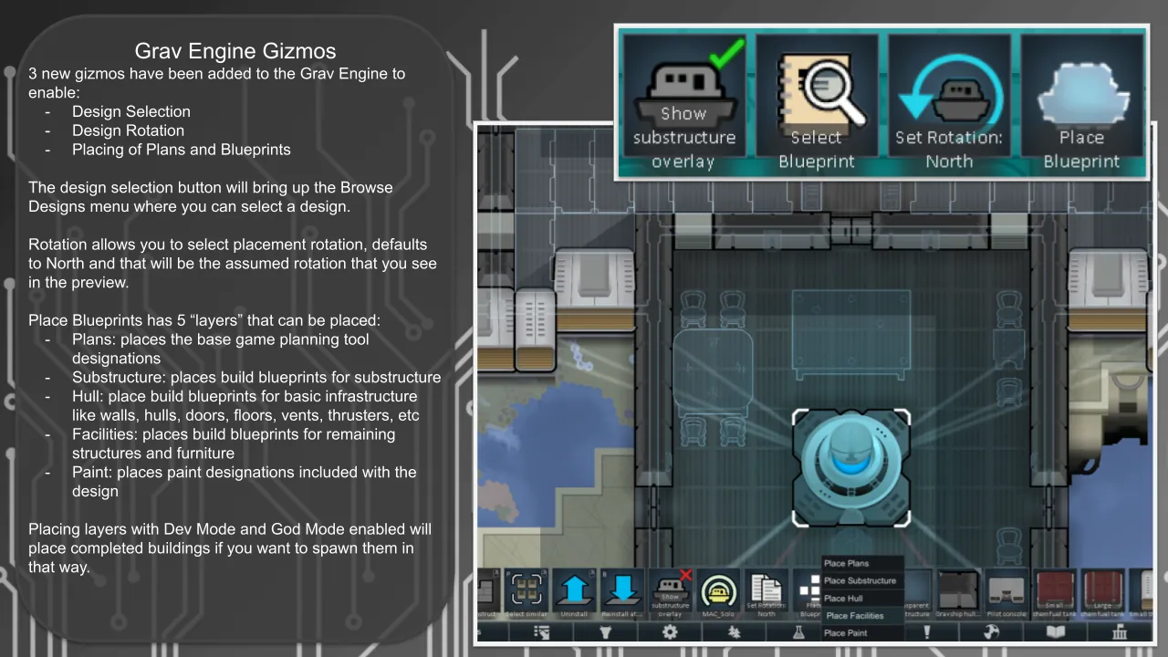 [*] [b]Place Blueprints:[/b] Select your Grav Engine and review the 3 new Gizmo Icons available for selecting a design, rotation, and placing plans or a layer of blueprints