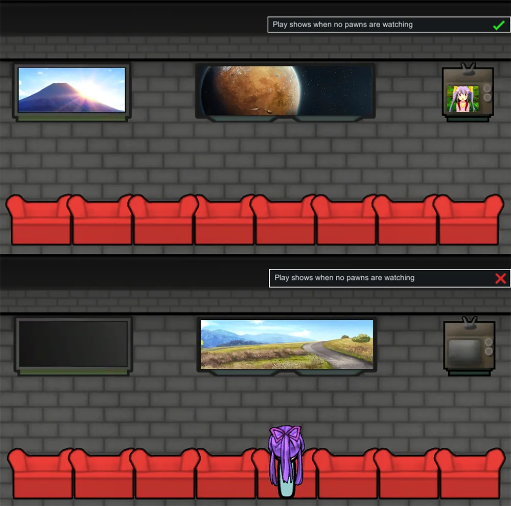 [b]Play shows when no pawns are watching[/b]: If enabled, TVs will play shows all the time, even when no pawns are watching. If disabled, TVs will only play shows when pawns are watching.