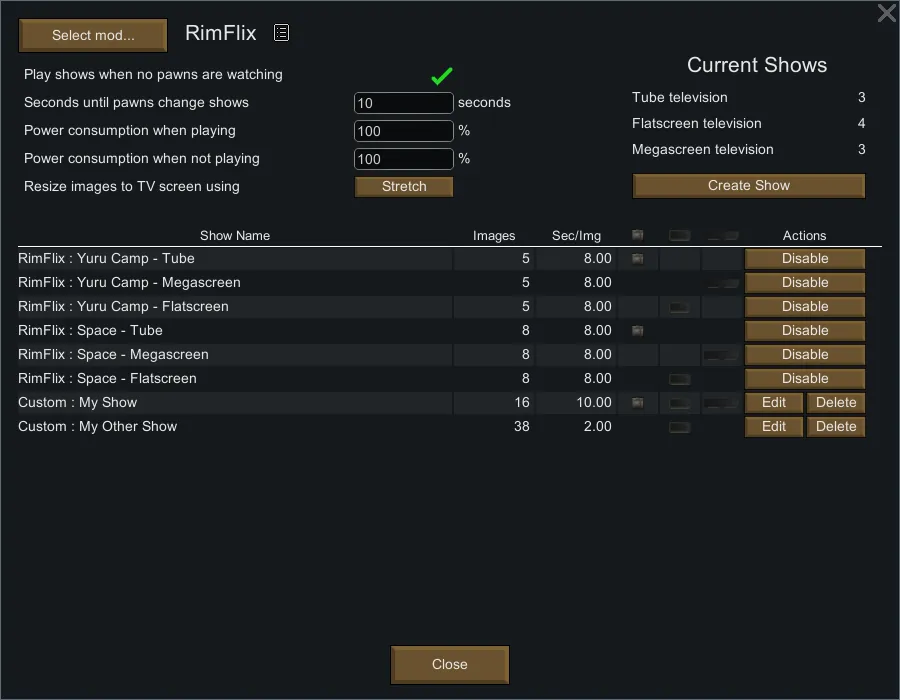 You can add shows others have created either from Steam Workshop or Github. [url=https%3A%2F%2Fgithub.com%2Fritsu%2FRimFlix-Anime-Loops%2Freleases]Here is an example.[/url][github.com] Remember to place them below this mod in the load order.