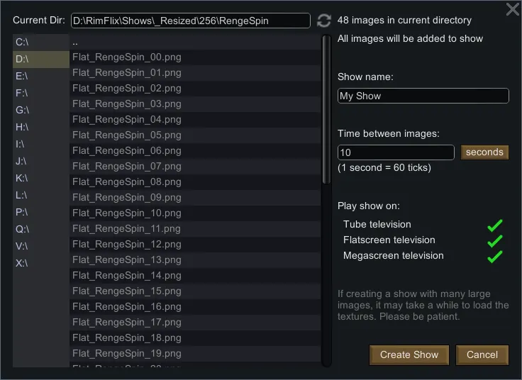 2. Browse to a folder that contains images you want to include in your show. All images (*.png, *.jpg) will be added. You can click an image to see how it will look in game.