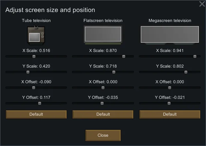 [b]Adjust sreen size and position[/b]: Click the icon at the top of the Settings window to open a new window that allows you to change the size and position of what the mod considers the "screen area" for each TV type.
