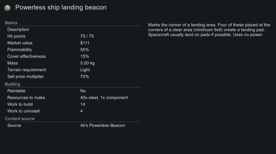 Adds powerless ship landing beacon. Requires no upkeep or fuel, but is otherwise identical to the vanilla beacons. Does not replace vanilla beacons.