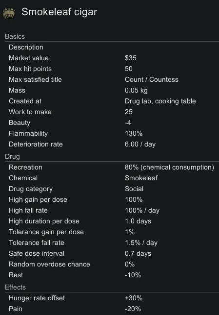 Allows for the refining of smokeleaf cigars, psychite coffe, jelly candy, and chocolate and ambrosia. Less addictive drugs.