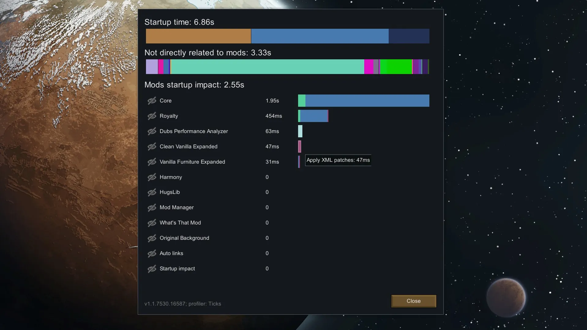 - Errors similar to "Could not load reference to Verse.JobDef named Play_Roulette" will appear on just the first load with this mod, but they are safe to ignore.