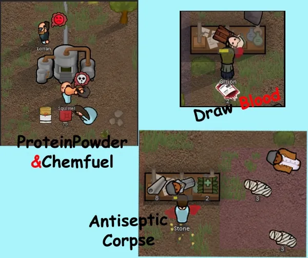 [*] Can use Mechanites to form(fake) AntisepticCorpses with RawMeats.