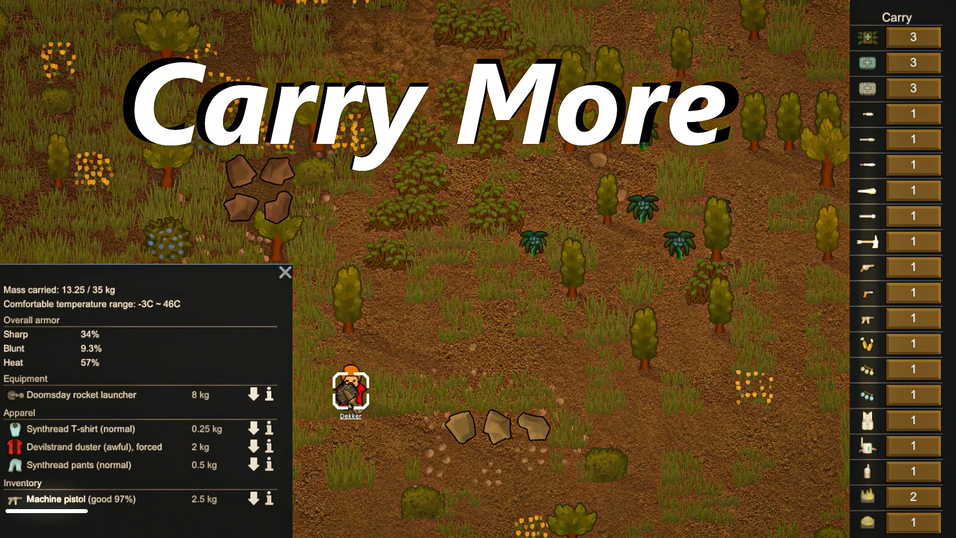 Adds the option to assign your pawns to carry other things besides medicine. You can also manually force colonists to pick up items that that can be carried. The carriable items selection is quite limited; it only offers the vanilla handguns/small melee weapons and all of the special weapons and artifacts. This mod utilizes the new vanilla carrying mechanic, so it should be compatible with every 1.3 mod out there.