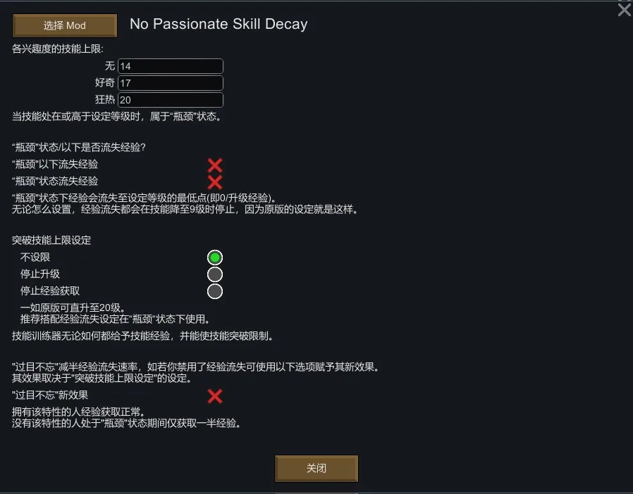 默认设置的效果:兴趣度无的技能在14级开始流失经验,好奇的技能在17级开始流失经验,狂热的技能从不流失经验,突破技能上限无需使用技能训练器。