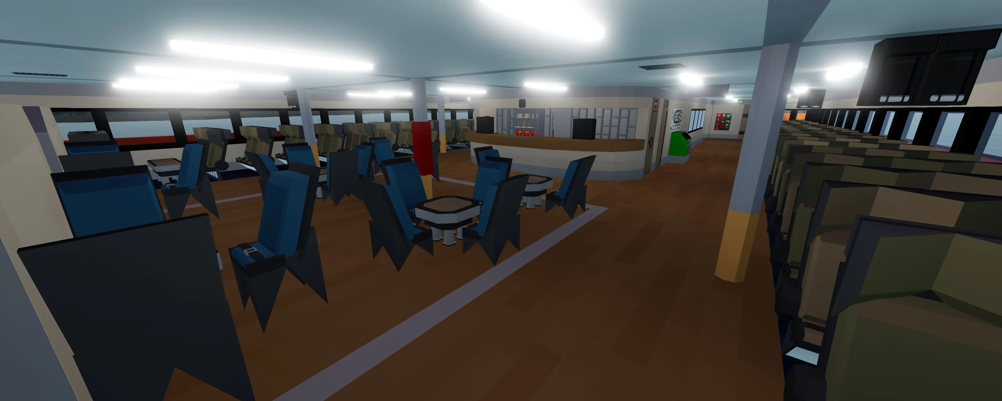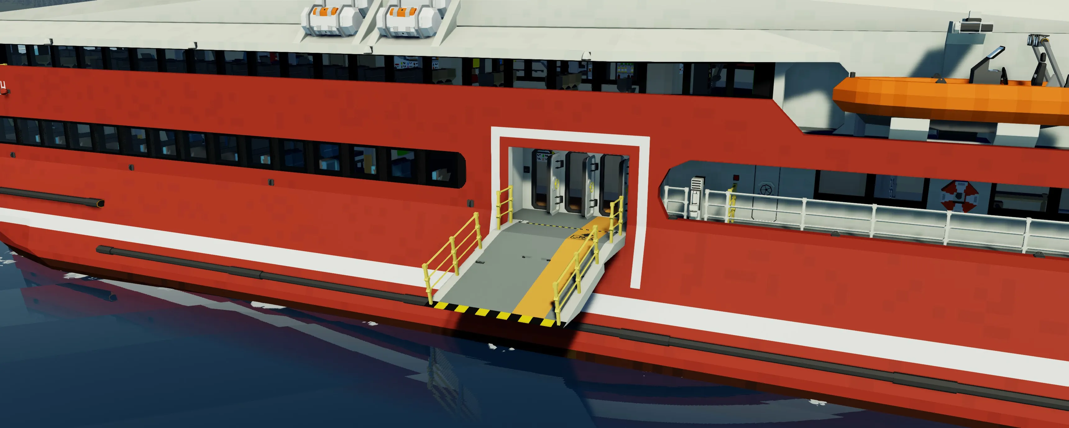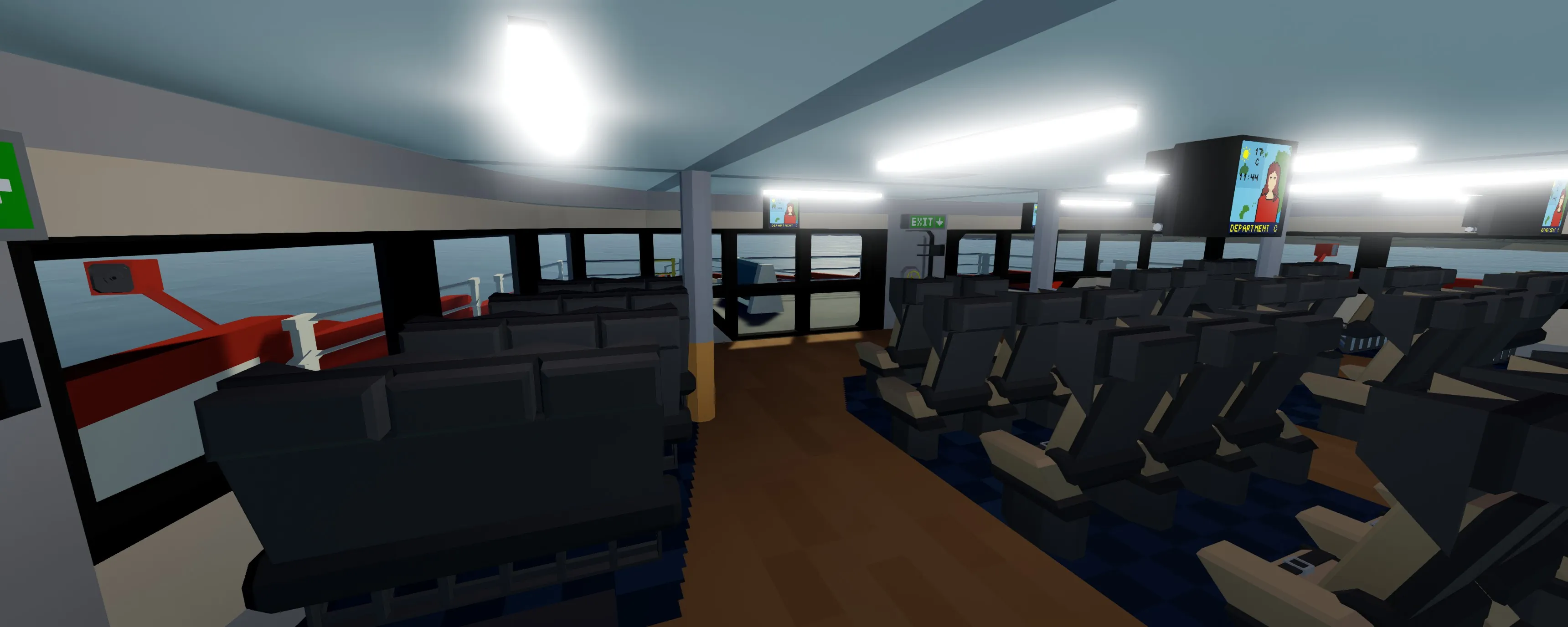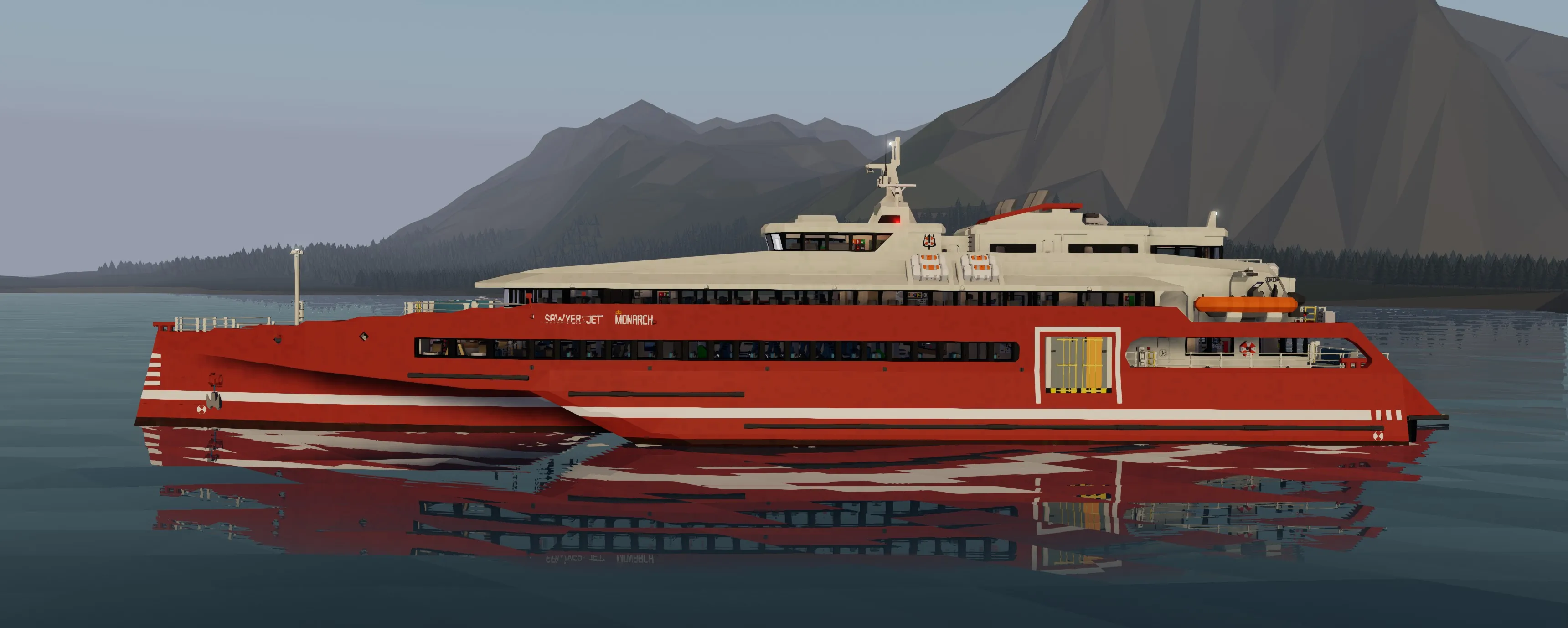 The Monarch is a 67 meter high speed passenger jet-ferry trimaran (yeah lol it's a mouthful). It has the capacity to transport over 400 passengers in comfort. The layout is split up into three different seating classes and has forward and rear outdoor seating. The monarch has two 24 cylinder 3x3 modular engines that power four water jets which can accelerate the vessel up to and exceeding 40 knots. The ferry has partial hydrofoil capabilities that slightly raise the pontoons out of the water for greater efficiency at high speeds. The bridge is equipped with Garmin MFDs and various systems for enhanced maneuverability. Large boarding ramps can be found on either side of the vessel for easy boarding. There is even an elevator at the stern as well as bike and large item storage. Navigational signage can be found pretty much everywhere round the ship in case you get lost. This build can also be rather laggy so using low physics settings might not be a bad idea.