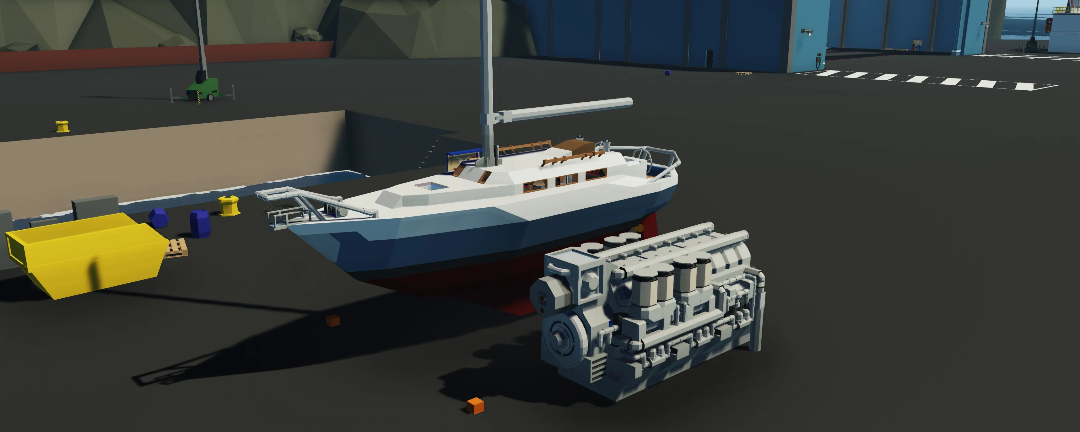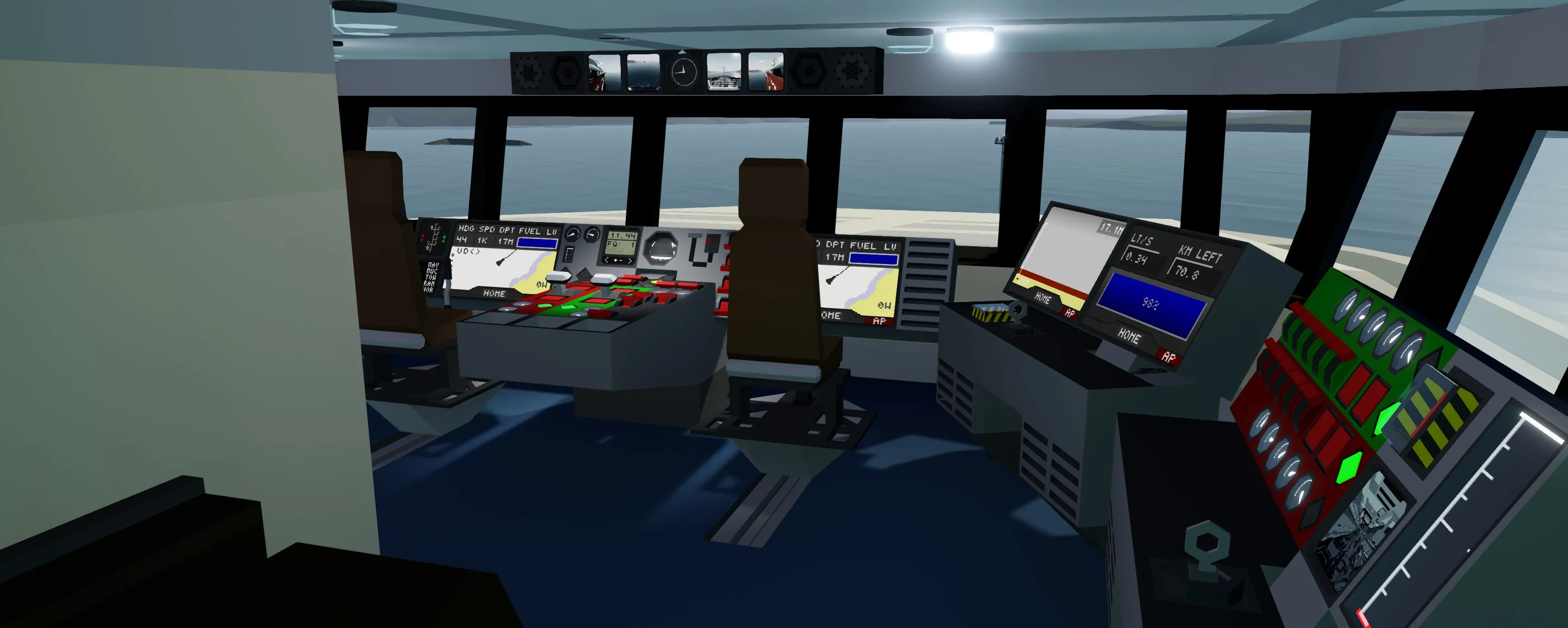 ENGINES: To start the engines find the console on the starboard side of the bridge and pretty much flip all the switches . Next you simply push the start engine button and they should start running. You can throttle the engines individually with the throttle levers on the center console or do them both by using W/S in the seat. If you flip the throttle mode switch it will put you into a maneuvering mode where the engines idle at a higher throttle so you can take advantage of the capabilities of the water jets.
