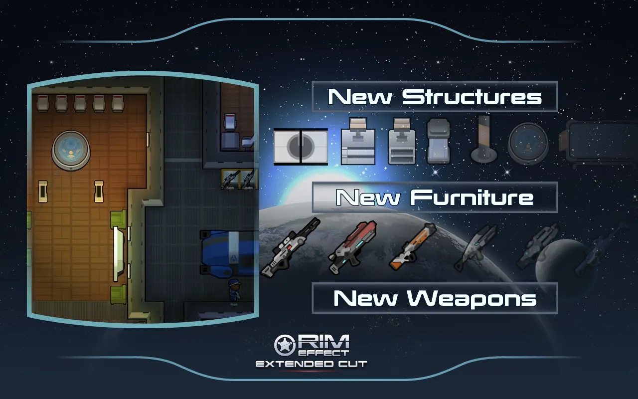 Rim Effect is a large overhaul mod series, adding the story, races, objects, and conflicts of Mass Effect universe into RimWorld. The Mass Effect elements are not meant to stand out, and as such are blended into the RimWorld style by utilising the same naming conventions and writing styles.