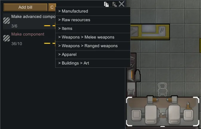 Categorized Crafting Bills adds a small button to each workbenches bill tab that presents the available bills in a series of submenus so you don't have to search the entire list for it.