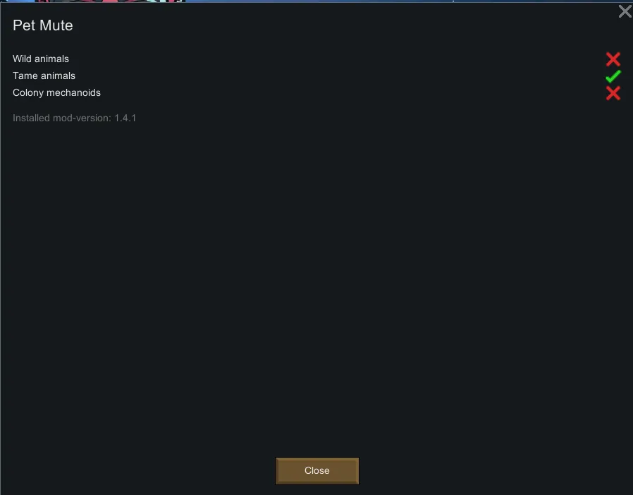 [url=https://steamcommunity.com/sharedfiles/filedetails/changelog/2529875612][img]https://img.shields.io/github/v/release/emipa606/PetMute?label=latest%20version&style=plastic&color=9f1111&labelColor=black[/img][/url] | tags: silence, animals, mechanoids