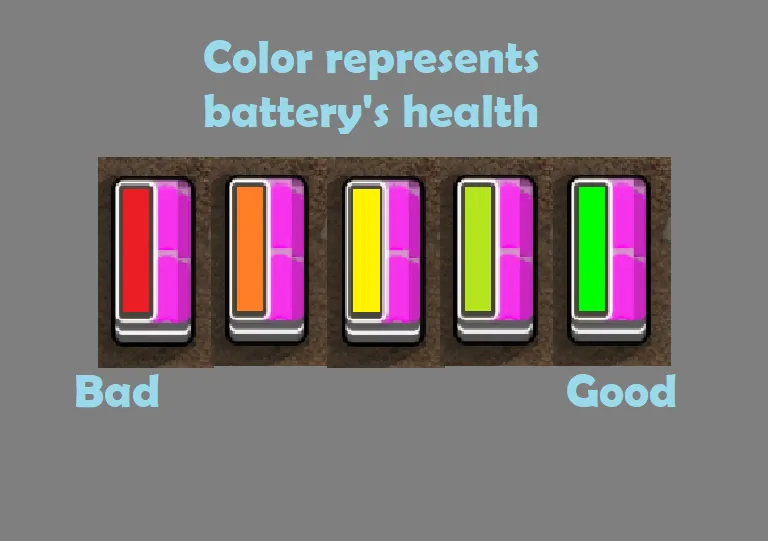 [b]Rechargeable batteries:[/b] Charging this type will now degrade it. Color represents the health of batteries (Green - Good health; Yellow = Ok; Orange to Red = Bad health). Currently, there are 3 types: