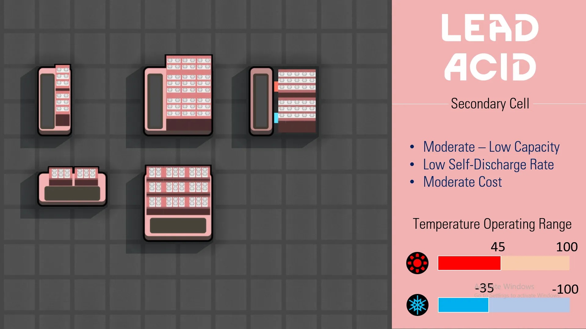 [*] [b] short circuits in large explosions will discharge all of the stored energy, and PUSH internal temperature up to 100C.[/b] So if you decided to put batteries indoor, be careful or your entire base will become a human bakery after one incident.