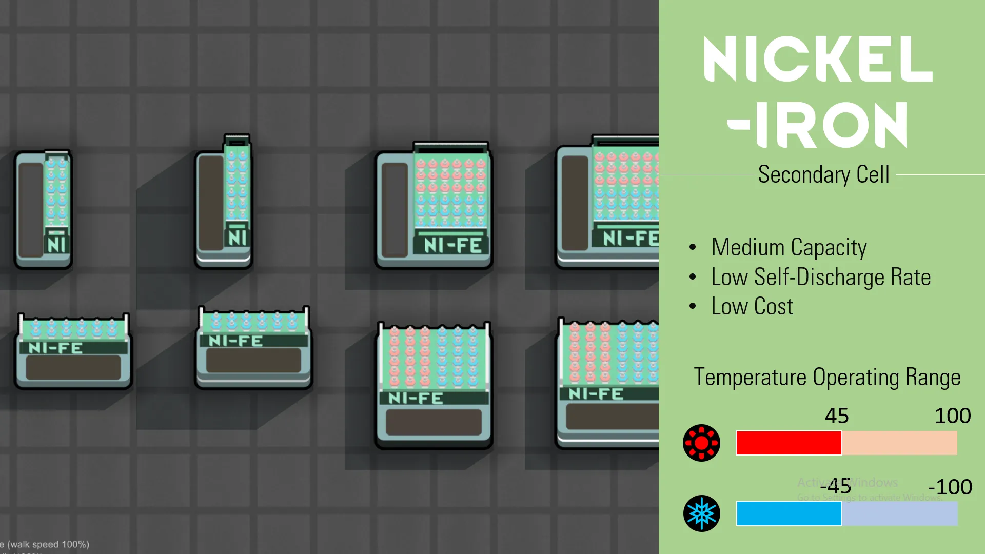 [*] Nickel-Iron. (Hold 2 times more charge compared to lead-acid, researching is easier)