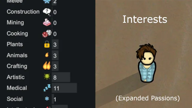 - [b]New interests[/b] (in addition to the original 3) are generated based on the initial level of the character's associated skill, the type of associated skill, whether the colonist already has an interest of that type, and certain backstory elements and traits that may force either positive or negative interests for some skills.