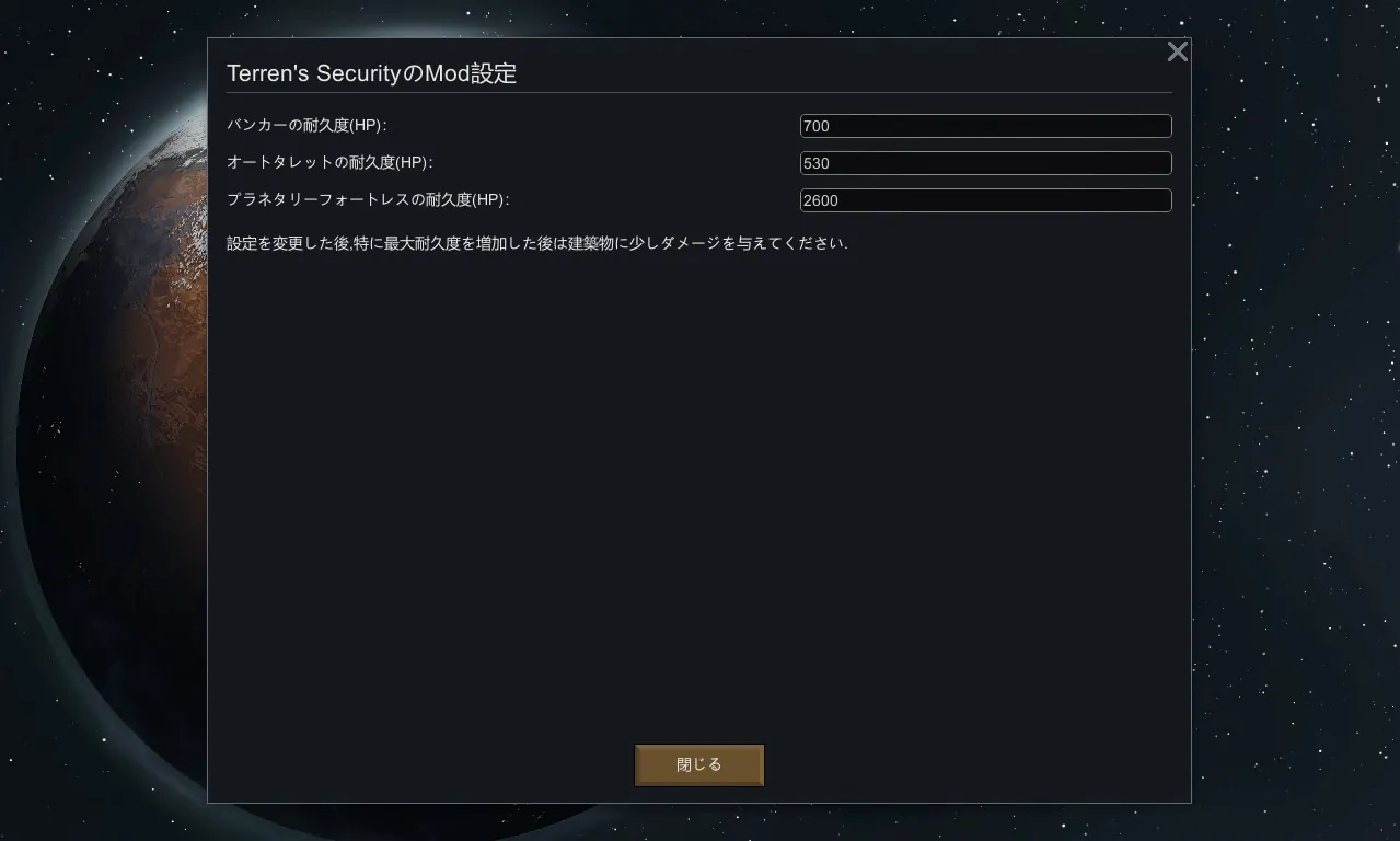 Modリストとゲーム経験に従って、建築物の耐久度(HP)を1から99999まで設定可能です。