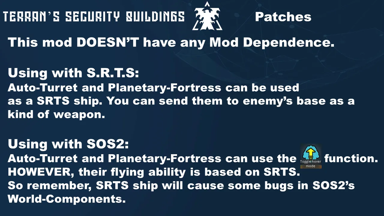 Auto-Turret and Planetary-Fortress can use the HOVER function. HOWEVER, their flying ability is based on SRTS. So, remember, SRTS ship will cause some bugs in SOS2’s World-Components.