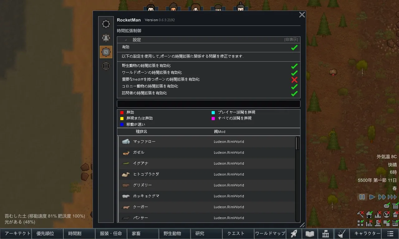 時間の遅延はRocketManの機能で、動物とワールドポーンのtick(1/60秒)レートを60Hzから5Hzに調整します。これにより、パフォーマンスにほとんど影響を与えることなく、マップ上に何百ものワールドポーンと動物を配置可能です。従って、ワールドポーンは問題にならないため、RuntimeGCの必要がなくなります。これは、大きなマップサイズと古いコロニーなどでパフォーマンスに大きな影響を与えます。(平均で+150TPS)