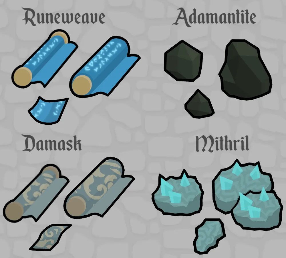 You'll also see things like Mithril longsword, Adamantite mace, Damask shirt etc