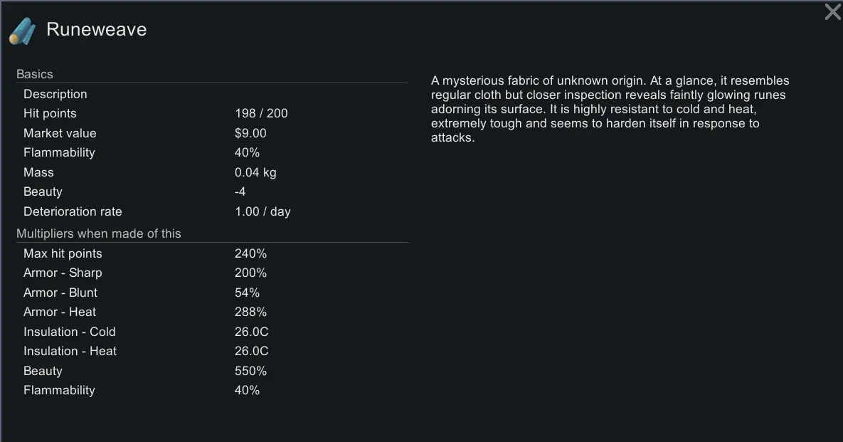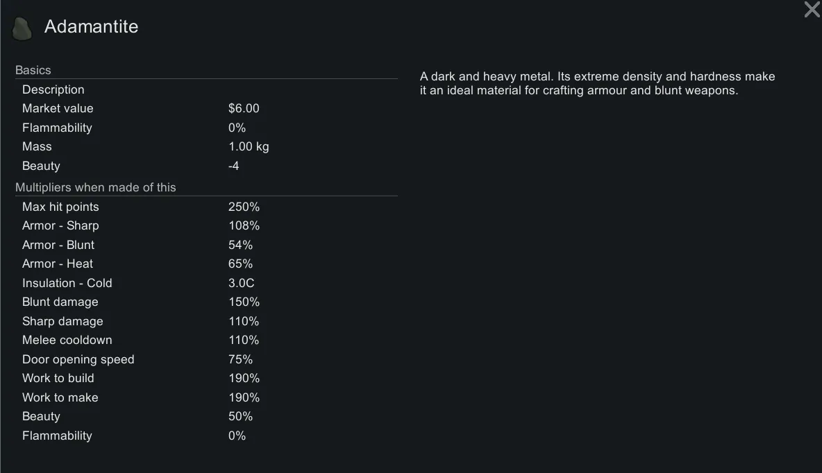 This mod changes plasteel, uranium, synthread and hyperweave to have a more medieval fantasy theme, they function exactly the same as their vanilla counterparts just with new names, descriptions and textures.