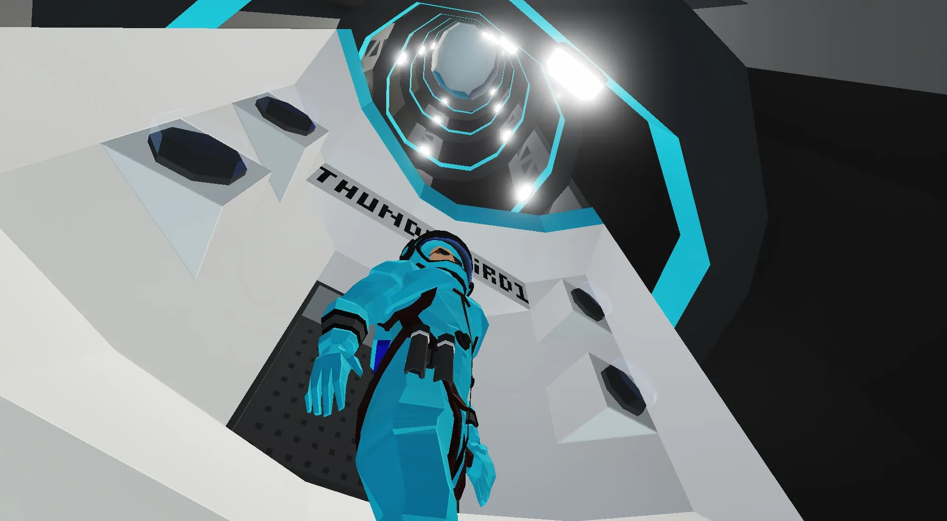 Thunderbird 1 is a high-speed vhicle piloted by Scott Teacy, trading out strength for speed (compared to Thunderbird 2) having the ability to go at a top speed of 15,000 mph (or 100 m/s in game) only able to achive rescue missions in orbit (out of orbit missions is Thunderbird 3's job). With Thunderbird 1's speed in mind it can respond to any emergancy in minutes